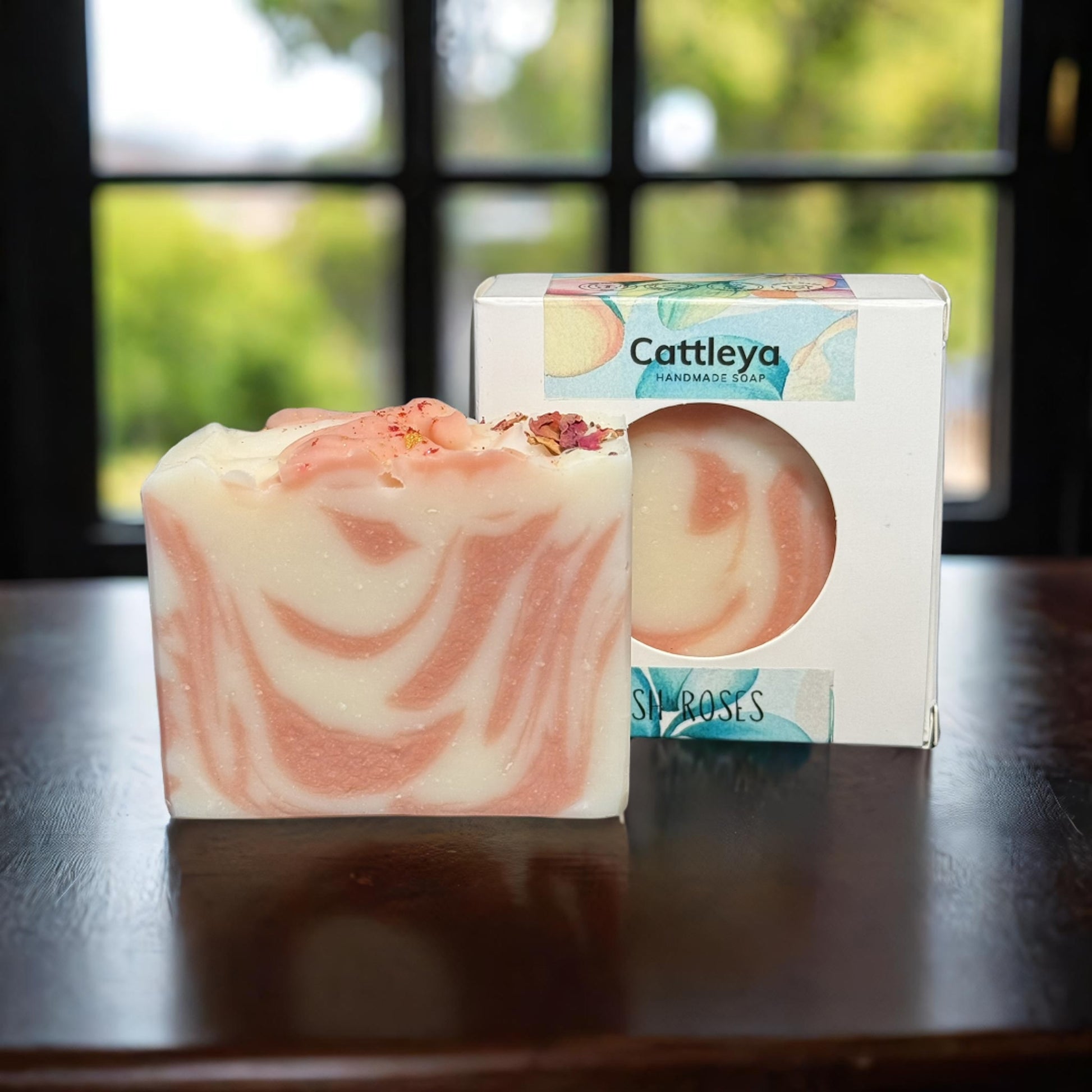 Coconut oil, Olive oil, palm oil, lye solution, Coconut milk, Distilled water, kaolin clay, rose clay, Himalayan salt, rose petals and Fragrance oil.