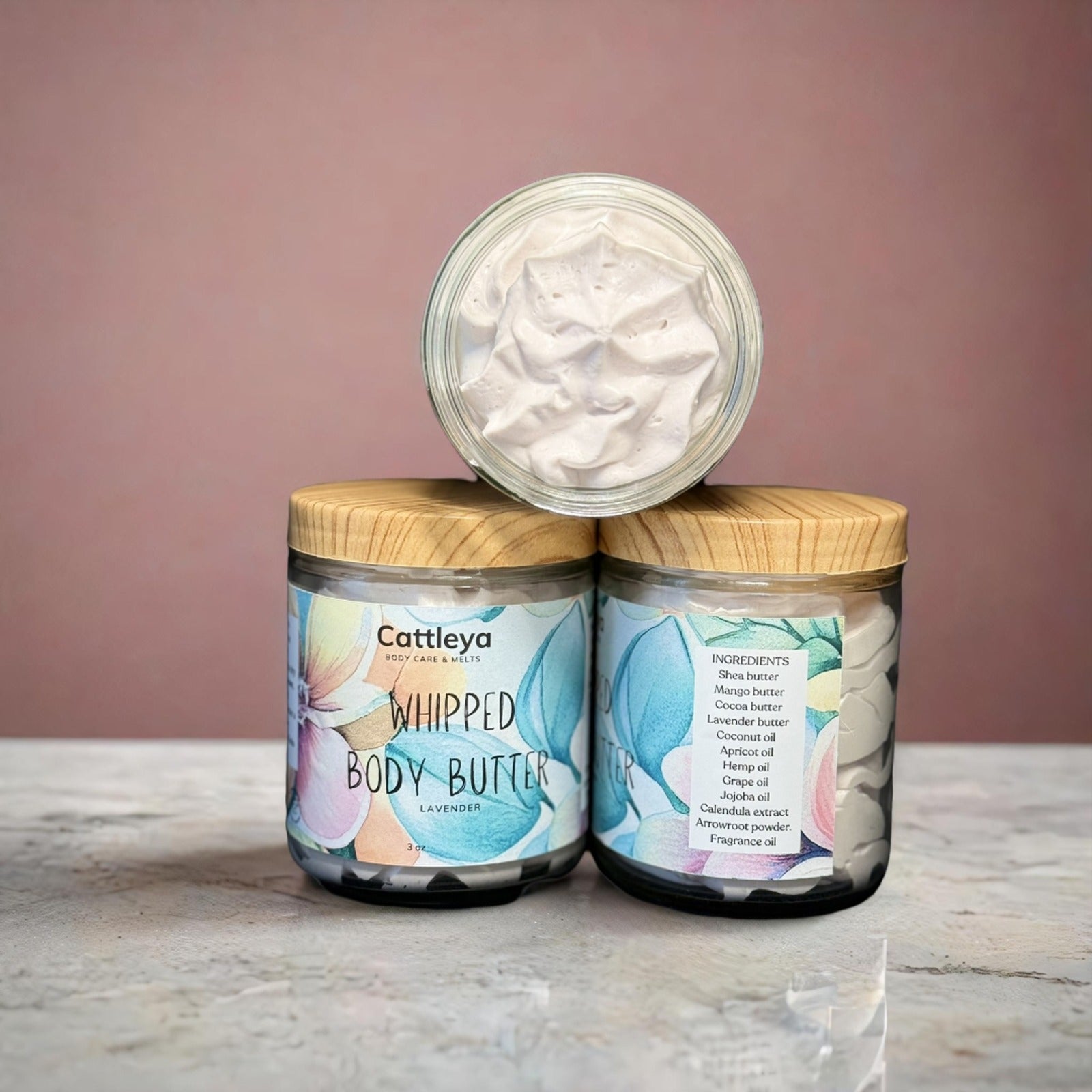 Shea butter, Mango butter, Cocoa butter, lavender butter, Coconut oil, Apricot oil, Hemp oil, Grape oil, Jojoba oil, Calendula extract, Arrowroot powder and Fragrance oil.