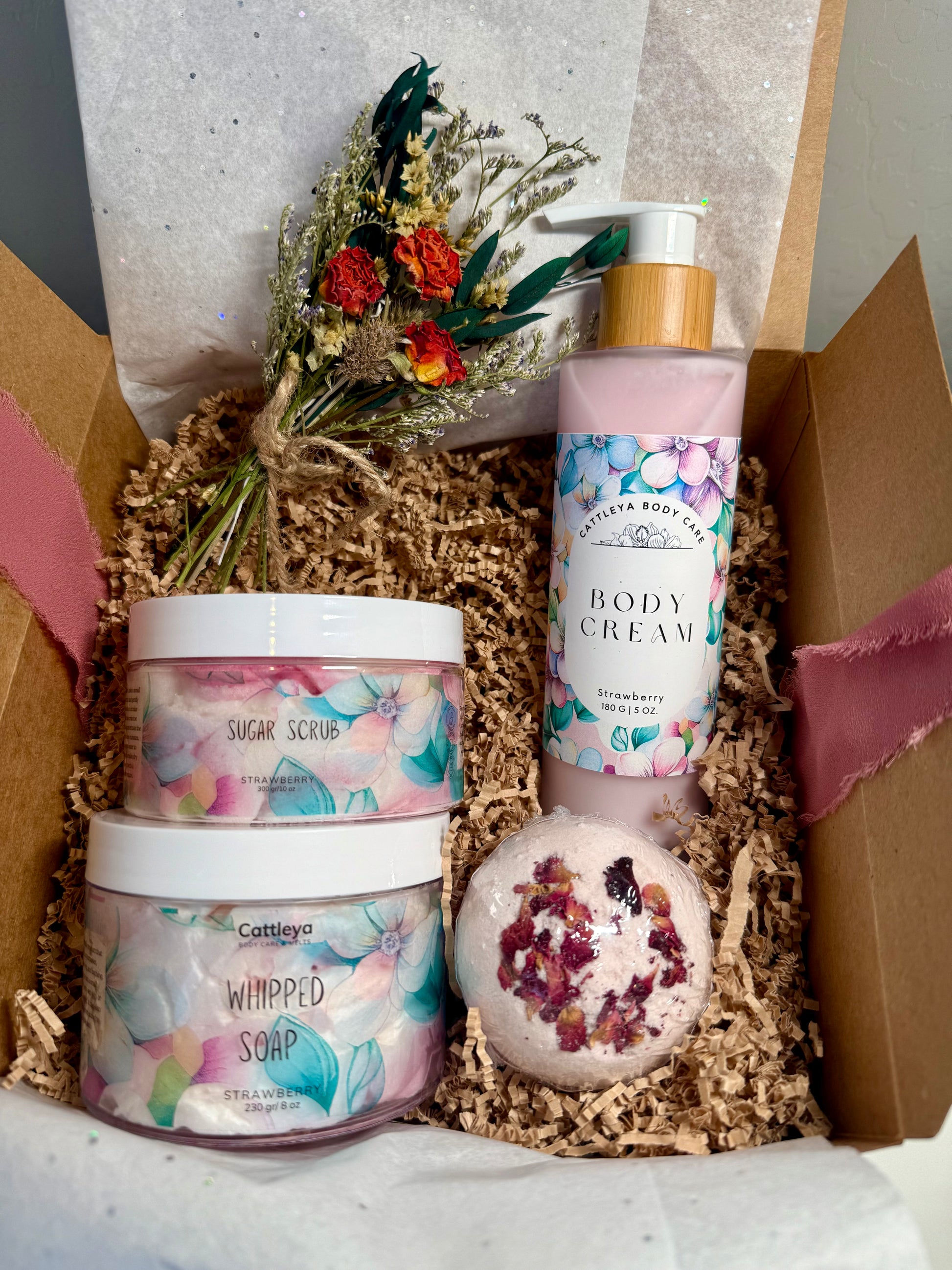 Indulge in the Strawberry Gift Box, a luxurious set that includes a sugar scrub, whipped soap, body lotion, bath bomb, and a beautiful bouquet of dry flowers. Treat yourself to a relaxing, aromatic experience that will leave your skin nourished and your senses invigorated. Perfect for gifts or self-care!