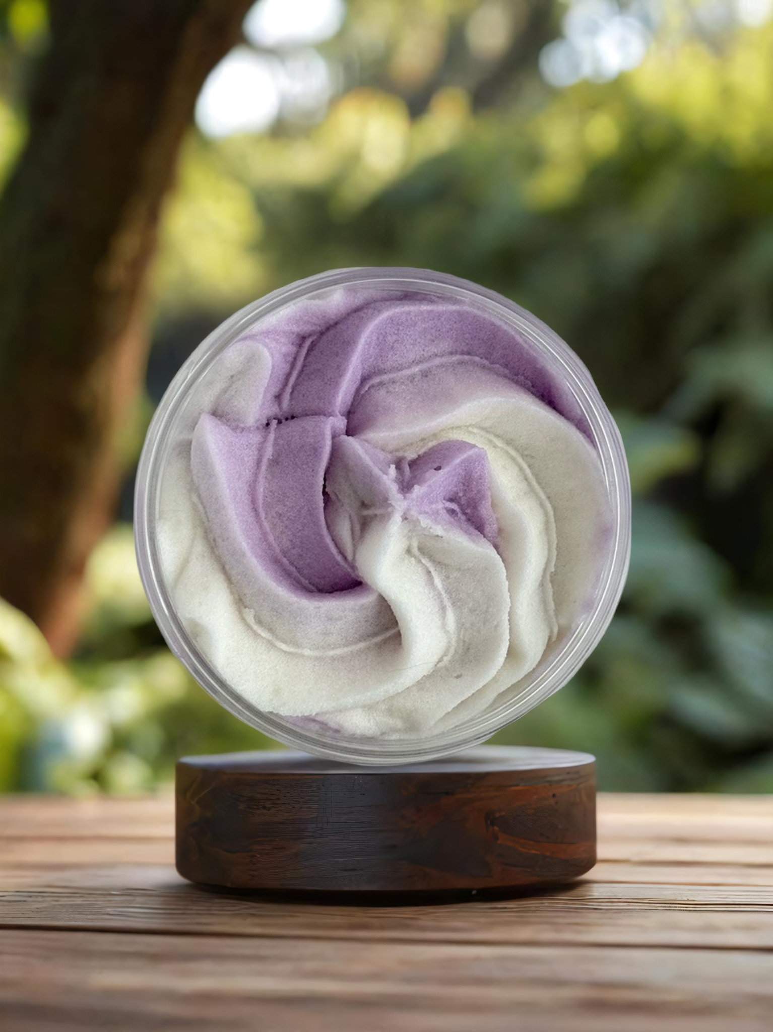 Shea butter, apricot kernel oil, Cocoa butter, Emulsifying wax, Stearic acid, Sodium Cocoyl Isethionate (SCI), Cocamidopropyl Betaine (CAPB), Vegetable glycerin, Distilled water, Liquid Germall plus, Cane sugar, Mica, Lemon and Eucalyptus essential oil