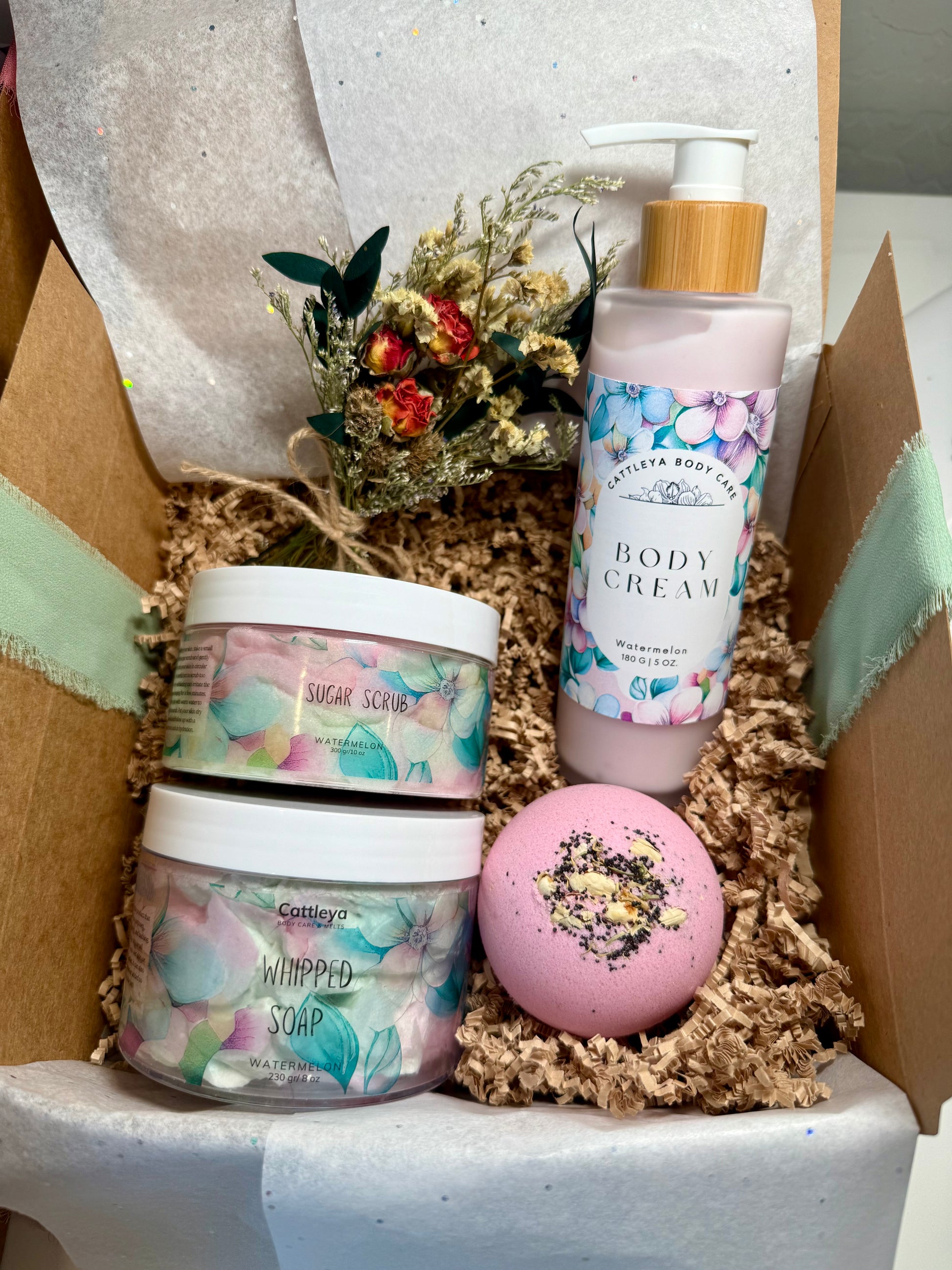 Indulge in the Watermelon Gift Box, a luxurious set that includes a sugar scrub, whipped soap, body lotion, bath bomb, and a beautiful bouquet of dry flowers. Treat yourself to a relaxing, aromatic experience that will leave your skin nourished and your senses invigorated. Perfect for gifts or self-care!